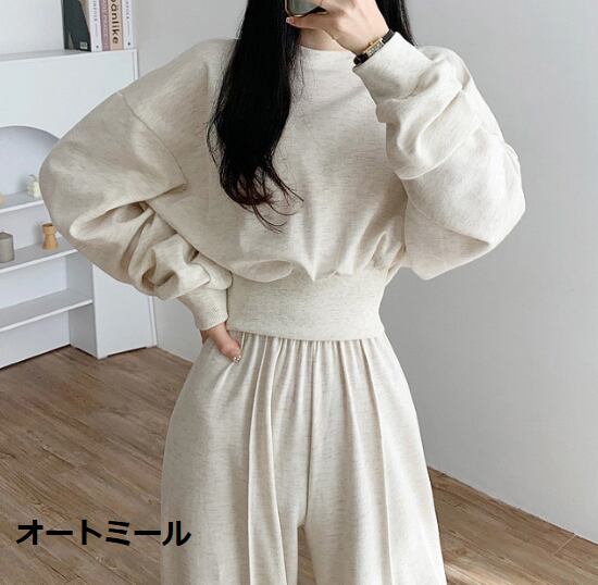 セットアップ レディース 2点セット 上下セット ツーピース トップス ボトムス スウェット トレーナー ワイドパンツ ズボン ラウンドネック ハイウエスト シンプル 無地 カジュアル ルームウェア