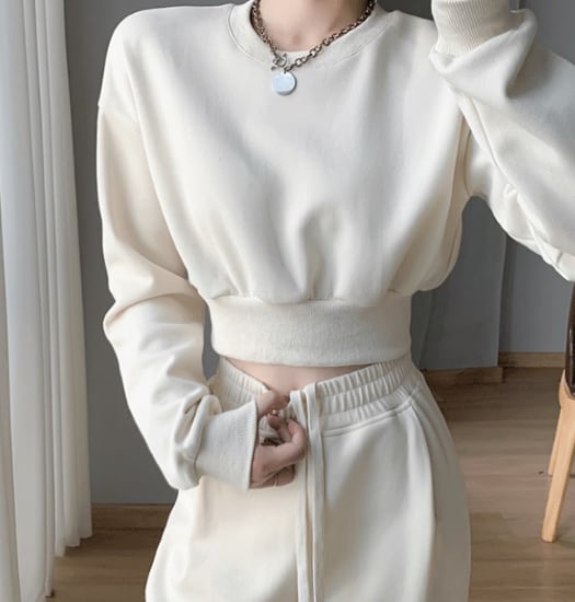 セットアップ レディース 上下セット 2点セット ツーピース スウェット トップス ボトムス トレーナー クロップド丈 ラウンドネック 長ズボン ウエストゴム シンプル 無地 カジュアル ルームウェア