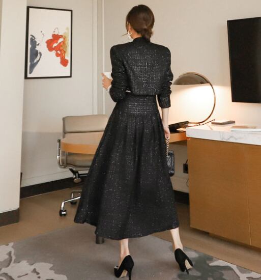 スカートスーツ レディース ツーピース 上下セット 2点セット ジャケット スカート ショート丈ジャケット ハイウエスト きれいめ エレガント フォーマル パーティー お呼ばれ 黒 ブラック スーツ