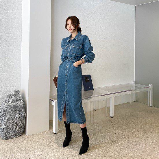 デニムワンピース レディース ワンピース フロントボタン 襟あり ポロ襟 長袖 ハイウエスト ポケット カジュアル お出かけ おしゃれ 無地 デニム 青 ブルー デニムワンピース 女性 ファッション