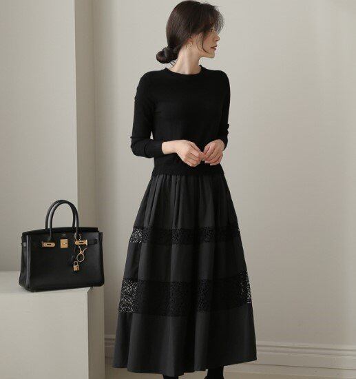 長袖ワンピース レディース ワンピース ミドル丈ワンピース 長袖 ニット 異素材ミックス 切り替え ラウンドネック ブラック ベージュ カジュアル お出かけ おしゃれ きれいめ シンプル ワンピース