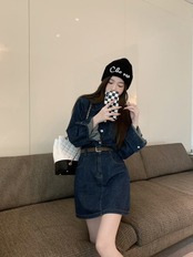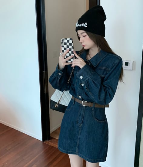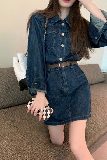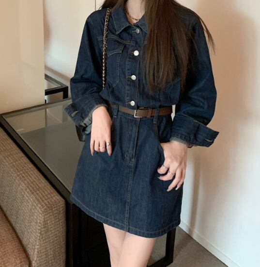 デニムワンピース レディース ワンピース ミニワンピース ミニスカート デニム 襟あり ポロ襟 ハイウエスト 長袖 カジュアル お出かけ おしゃれ ボタン ショート丈 ダークブルー デニムワンピース