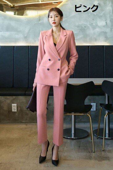 パンツスーツ レディース ツーピース セットアップ 上下セット ジャケット ボトムス スーツ襟 ダブルブレスト フォーマル きれいめ オフィス お呼ばれ スタイリッシュ 通勤 OL シンプル 無地