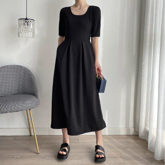半袖ワンピース レディース ワンピース 半袖 ハイウエスト ロングワンピース シンプル 無地 Uネック 黒 ブラック カジュアル お出かけ おしゃれ 春夏 プルオーバー 半袖ワンピース レディース