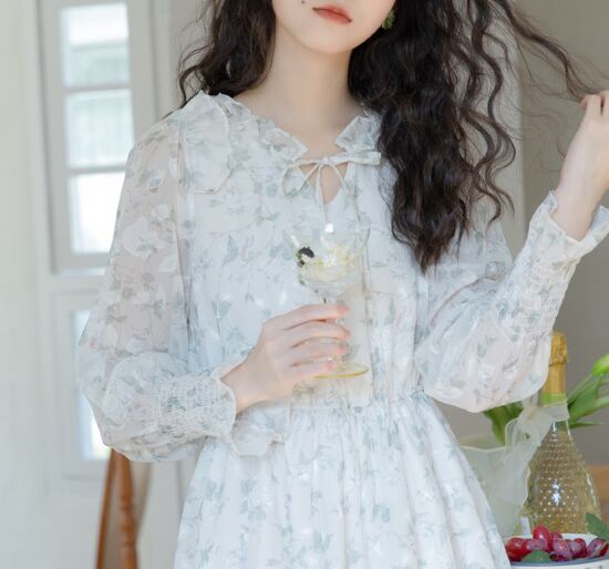 花柄ワンピース レディース ワンピース フラワー 総柄 シフォンワンピース フリル プルオーバー 長袖 フェミニン ガーリー リボン Aラインスカート カジュアル お出かけ おしゃれ ハイウエスト