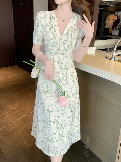 シフォンワンピース レディース 半袖ワンピース 総柄 Vネック ミドル丈ワンピース シャーリング プルオーバー カジュアル お出かけ きれいめ おしゃれ 春夏 Aラインスカート ワンピース 女性