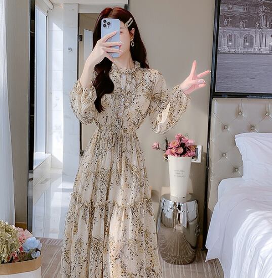 シフォンワンピース レディース ワンピース プリントワンピース 総柄 フローラル フリルネック ボタン 長袖ワンピース ミドル丈ワンピース Aラインスカート フェミニン カジュアル きれいめ 春夏