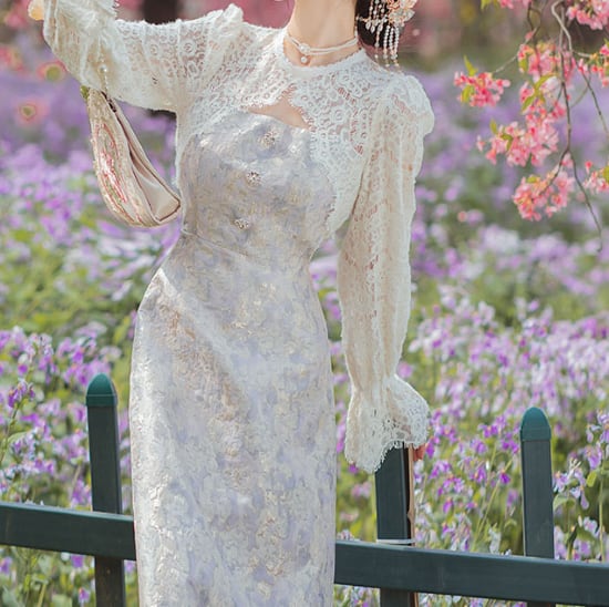 花柄ワンピース レディース ワンピース レース ミドル丈ワンピース フェミニン 長袖 刺繍 ラウンドネック 重ね着風 フェイクツーピース きれいめ エレガント おしゃれ お呼ばれ フォーマル レース