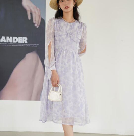 花柄ワンピース レディース ワンピース シフォンワンピース 膝丈ワンピース シースルー ハイウエスト ラウンドネック 春夏 レトロ きれいめ カジュアル お出かけ おしゃれ 長袖 フラワー フローラル