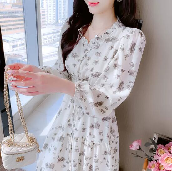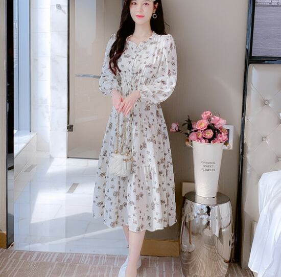 花柄ワンピース レディース ワンピース シフォンワンピース フリルネック ランタンスリーブ ハイウエスト 長袖 ミドル丈ワンピース カジュアル お出かけ おしゃれ きれいめ フェミニン ワンピース