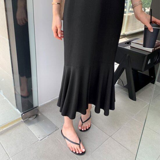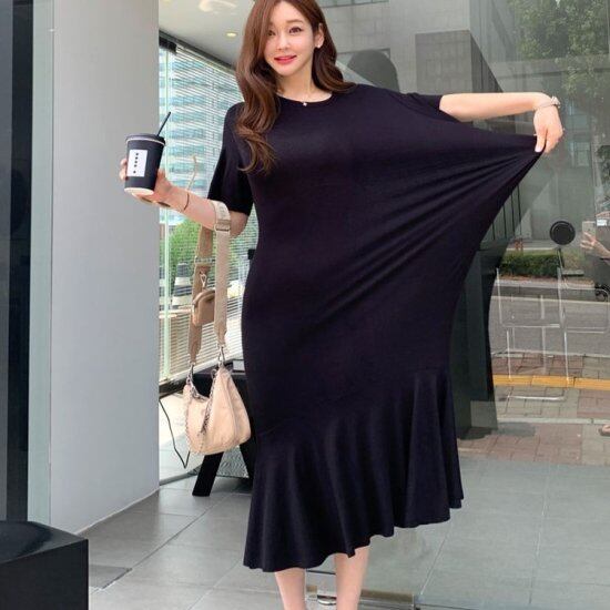 ワンピース レディース 半袖ワンピース マーメイドワンピース Tシャツワンピース 裾フリル ストレッチ ラウンドネック 黒 ブラック Aライン かわいい きれいめ カジュアル リゾート 春夏