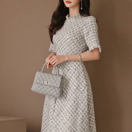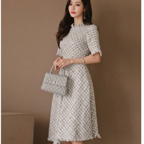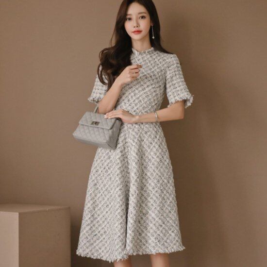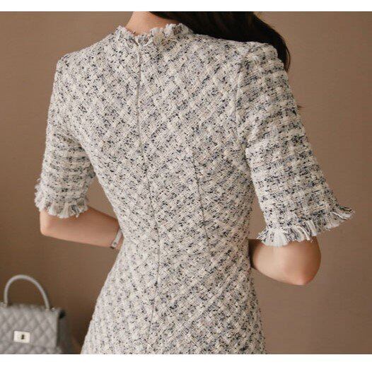 ワンピース レディース 半袖ワンピース ツイード ノーカラー 襟なし スタンドカラー 五分袖 Aラインワンピース フレアワンピース レトロ クラシカル かわいい きれいめ 上品 おしゃれ デート