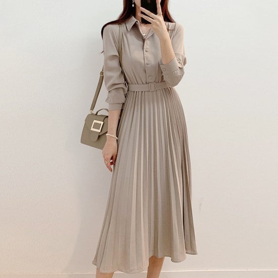 プリーツが優雅に揺れるミモレ丈ワンピース。