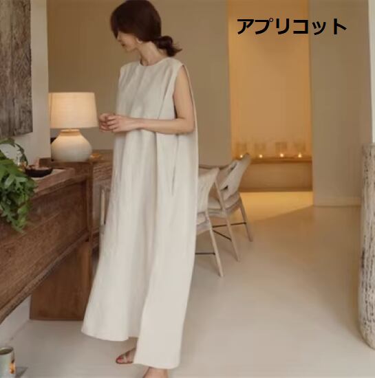 ロングワンピース レディース ワンピース ノースリーブワンピース ロング丈 ラウンドネック シンプル 無地 ゆったり ルーズ カジュアル お出かけ リゾート 夏 プルオーバー コットンリネン ロング