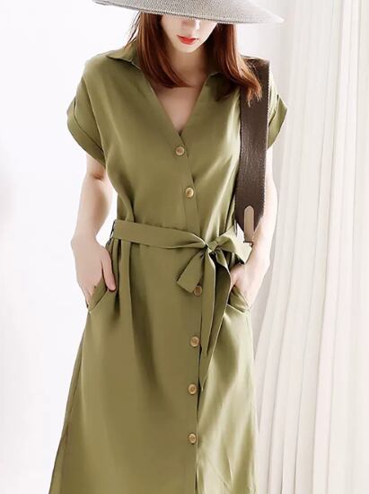 半袖ワンピース レディース ワンピース シャツワンピース ミドル丈ワンピース Vネック フロントボタン ウエストリボン グリーン 緑 カジュアル お出かけ おしゃれ シンプル 無地 半袖ワンピース