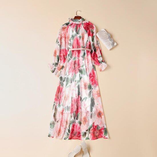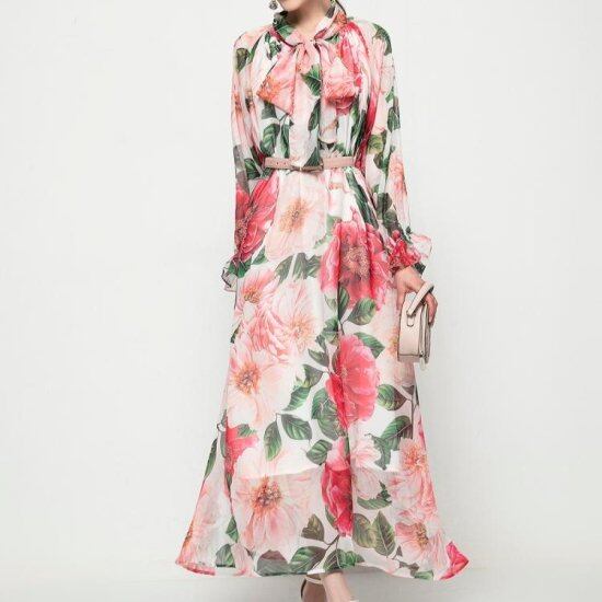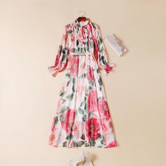 ワンピース レディース 花柄 ロングワンピース ボウタイ リボン ロング丈 マキシ丈 花柄ワンピース フラワープリント プリントワンピース 総柄 レトロ クラシカル きれいめ 上品 エレガント 長袖