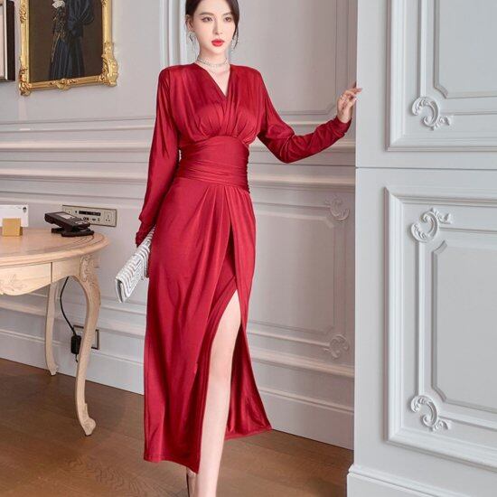 ロングワンピース レディース ドレス Vネックワンピース カシュクール スリット イブニングドレス ハイウエスト スリム 長袖 クラシカル きれいめ セクシー エレガント パーティー お呼ばれ