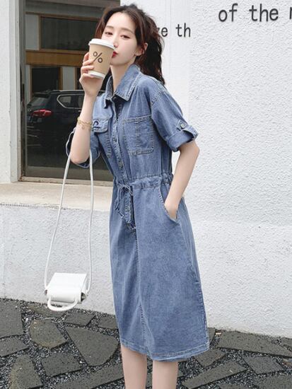 デニムワンピース レディース ワンピース 半袖ワンピース ウエストリボン 襟あり ポロ襟 ボタン ポケット 膝丈ワンピース ミドル丈 ハイウエスト カジュアル お出かけ 春夏 デニムワンピ 女性 半袖