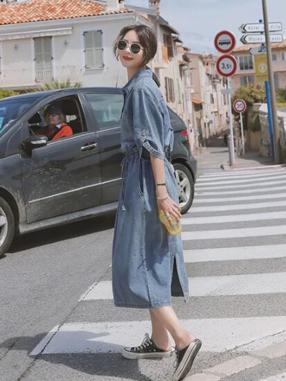 デニムワンピース レディース ワンピース ミドル丈ワンピース 半袖ワンピース 襟あり ポロ襟 カジュアル お出かけ ウエストリボン ボタン ポケット ハイウエスト デニムワンピ 春夏 コットン 綿