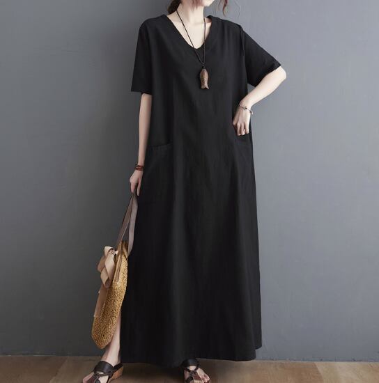 ロングワンピース レディース ワンピース 半袖ワンピース ロング丈 Vネック ゆったり ルーズシルエット 体型カバー シンプル 無地 ポケット スリット カジュアル お出かけ リラックス 春夏 女性