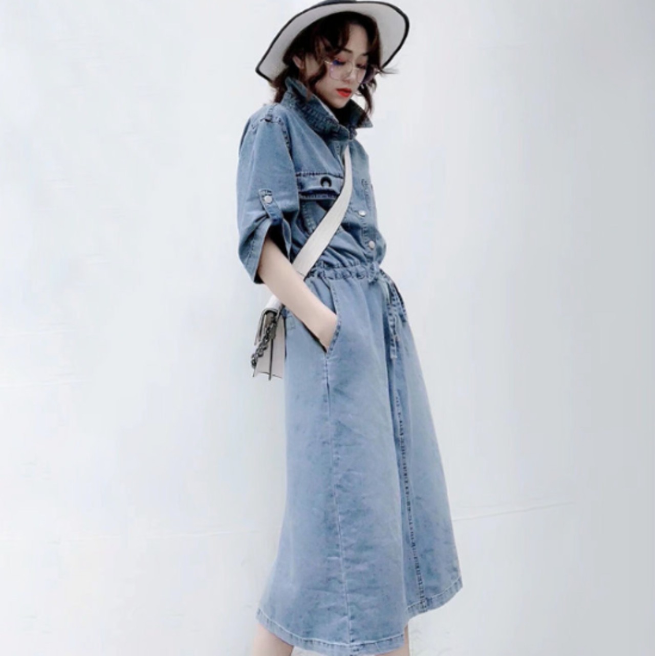 デニムワンピース レディース ワンピース 五分袖ワンピース シャツワンピース ミドル丈ワンピース ウエストリボン ボタン ポケット 襟あり ポロ襟 カジュアル お出かけ 春夏 無地 コットン ワンピ