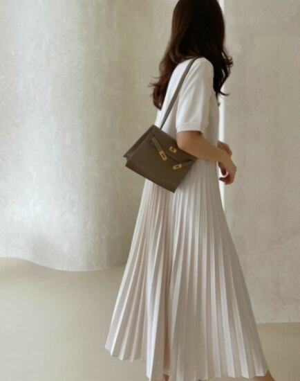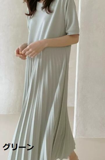 半袖ワンピース レディース ワンピース ロングワンピース プリーツスカート ラウンドネック 綿 コットン グリーン ホワイト 緑 白 カジュアル 無地 お出かけ おしゃれ シンプル 春夏 ファッション