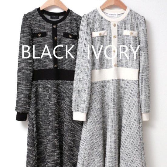 ワンピース レディース フレアワンピース Aラインワンピース ツイード ハイウエスト 長袖 配色ワンピース ブラック アイボリー かわいい きれいめ 上品 清楚 おしゃれ オフィス デート お呼ばれ