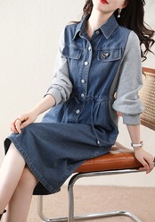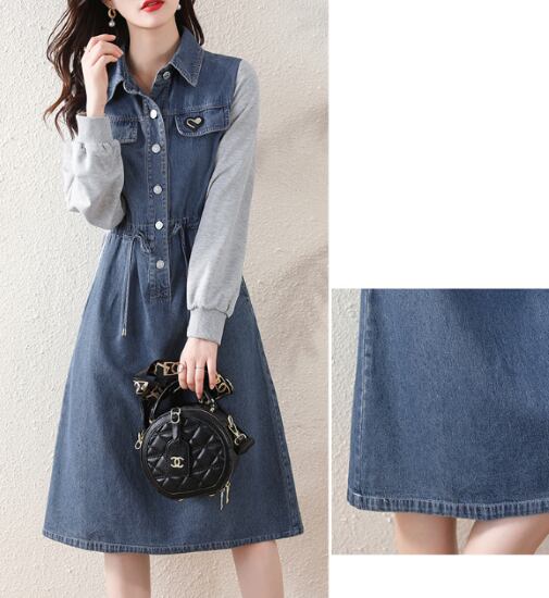 デニムワンピース レディース ワンピース 膝丈ワンピース ミドル丈 長袖ワンピース 異素材ミックス 切り替え 襟あり ポロ襟 ボタン Aラインスカート ウエストリボン カジュアル お出かけ おしゃれ