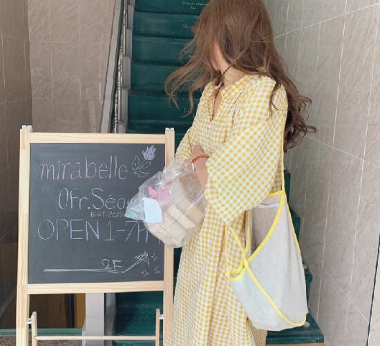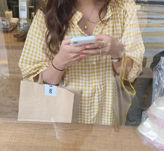 シャツワンピース レディース ワンピース 七分袖ワンピース ロングワンピース スタンドカラー イエロー 黄色 チェック柄 格子柄 ギンガムチェック ゆったり ルーズ 体型カバー ウエストリボン 春夏