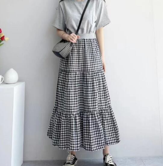 ロングワンピース レディース ワンピース 半袖ワンピース ティアードスカート 切り替え 無地 チェック柄 格子柄 ギンガムチェック ラウンドネック カジュアル お出かけ おしゃれ ハイウエスト 春夏
