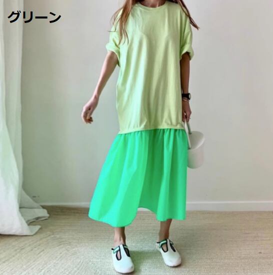 ロングワンピース レディース 半袖ワンピース ラウンドネック ネオンカラー 蛍光カラー シンプル 無地 カジュアル お出かけ おしゃれ 春夏 コットン 綿 切り替えワンピース ロングワンピ 女性 半袖