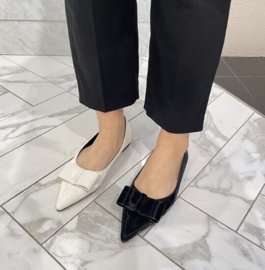リボンがぱっと目を引くポインテッドトゥパンプス。