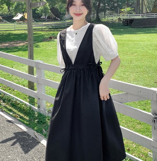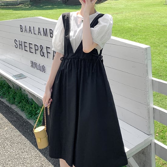 セットアップ レディース 半袖トップス パフスリーブ ノースリーブワンピース ハイウエスト 2点セット 重ね着 レイヤードスタイル ラウンドネック コントラストカラー 膝丈ワンピース Aラインスカート