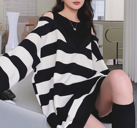長袖ワンピース レディース ワンピース ミニワンピース チュニック ボーダー モノトーン コントラストカラー 肩見せ セクシー カジュアル おしゃれ ラウンドネック ゆったり ルーズシルエット 女性