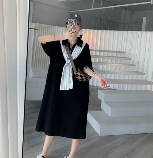 半袖ワンピース レディース ワンピース ミドル丈ワンピース ショール付き 2点セット シンプル 無地 ポロ襟 襟あり グレー ブラック ゆったり ルーズシルエット カジュアル お出かけ 女性 春夏