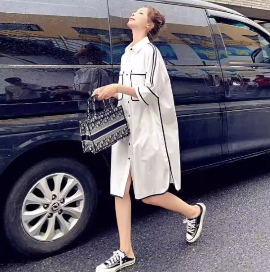 コントラストカラーのラインがアクセントになるシャツワンピース。