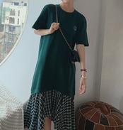 Tシャツワンピース レディース ワンピース 半袖ワンピース ラウンドネック ミドル丈ワンピース ワンポイント 切り替え 無地 チェック柄 マーメイドシルエット カジュアル フリルスカート 春夏 女性