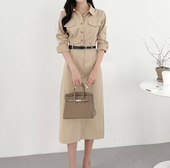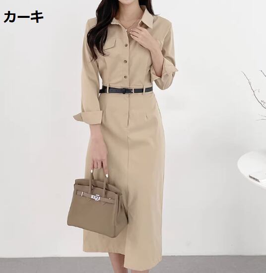 シャツワンピース レディース ワンピース ミドル丈ワンピース 長袖ワンピース ポロ襟 襟あり プルオーバー カジュアル お出かけ おしゃれ きれいめ ボタン ハイウエスト スリット 女性 ワンピース