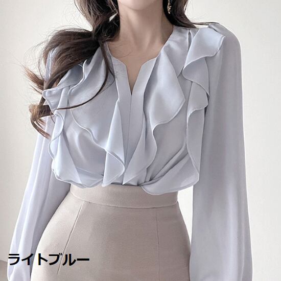 シフォンブラウス レディース シャツ 長袖ブラウス トップス Vネック フリル プルオーバー ボリューム ランタンスリーブ きれいめ エレガント フォーマル お呼ばれ パーティー カジュアル お出かけ