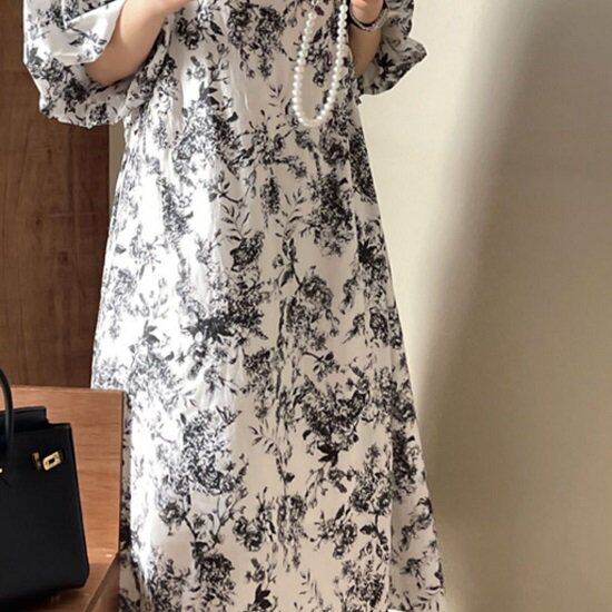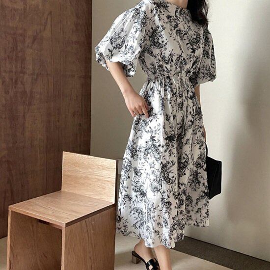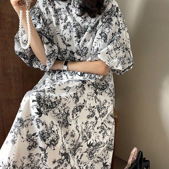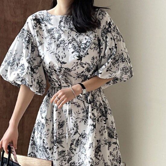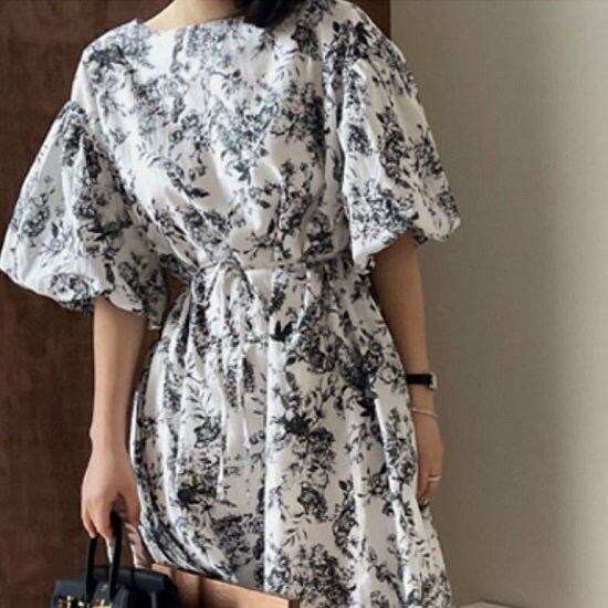 ワンピース 花柄 パフスリーブ 花柄ワンピ プリントワンピース ボリューム袖 半袖 5分袖 夏 ウエストマーク ロング丈 ロングワンピ 膝下 フレア Aライン ワンピース 花柄 パフスリーブ