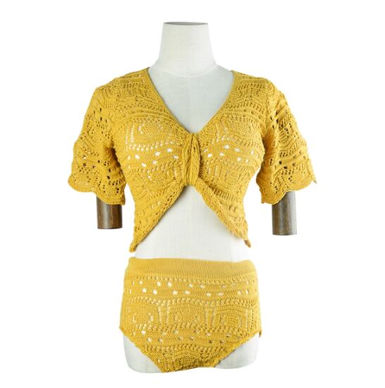 水着 レディース ツーピース 上下セット 2点セット スイムウェア ビーチウェア クロシェ編み ニット 半袖 Vネック ペプラム 日焼け対策 UV対策 カジュアル おしゃれ 海 ビーチ プール 海水浴