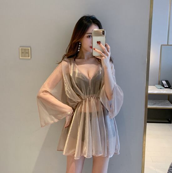 ビキニ レディース 水着 3点セット カバーアップ スイムウェア ビーチウェア ショートパンツ シースルー シアー Vネック 体型カバー UV対策 日焼け対策 海 リゾート プール 夏 海水浴 女性
