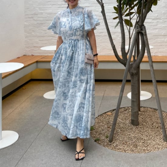 ロングワンピース レディース ワンピース 半袖ワンピース スタンドカラー ウエストリボン 総柄 ハイウエスト レッド ブルー 赤 青 春夏 カジュアル お出かけ おしゃれ シフォンワンピース 女性