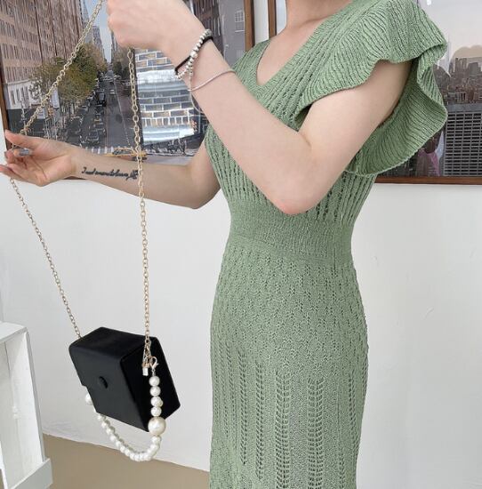 ニットワンピース レディース ワンピース インナー付き ツーピース 2点セット 半袖ワンピース Vネック 透かし編み ミドル丈ワンピース インナーキャミソール カジュアル お出かけ きれいめ 女性