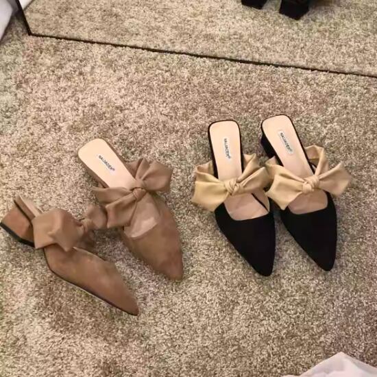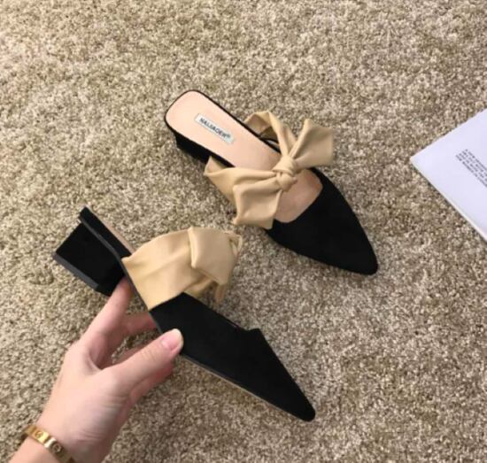 ミュール レディース 靴 シューズ パンプス ポインテッドトゥ リボン 太ヒール チャンキーヒール スエード カジュアル お出かけ おしゃれ シック ハーフサンダル 黒 ブラック 履きやすい 女性