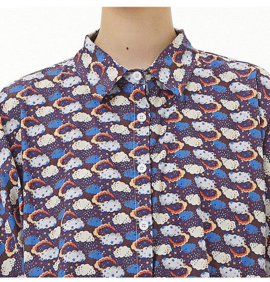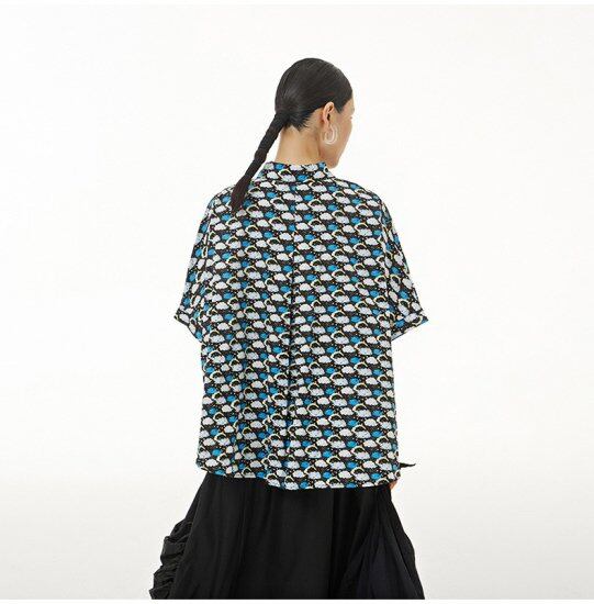 プリントシャツ ブラウス ビッグシルエット 幾何学 模様 サマー 半袖 5分袖 レトロ 雲 フロントボタン スリット 春 カジュアル デザイン トップス 体型カバー おしゃれ 柄 リゾート レディース