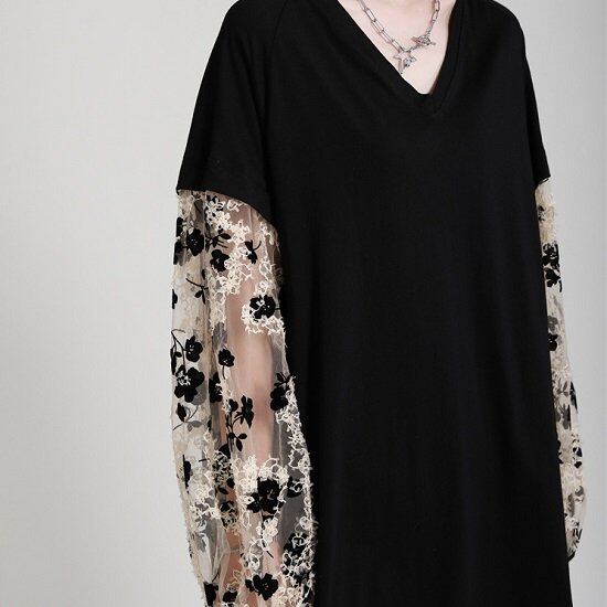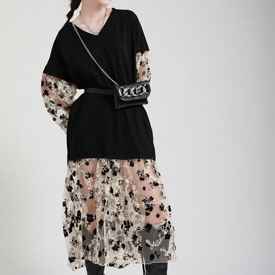 異素材ワンピース 長袖 ミドル丈 ミモレ丈 花柄 シースルー シアー 長袖ワンピ フレア ドッキングワンピ 異素材 ボリューム袖 バルーン袖 Vネック ゆったり 異素材ワンピース 長袖 ミドル丈