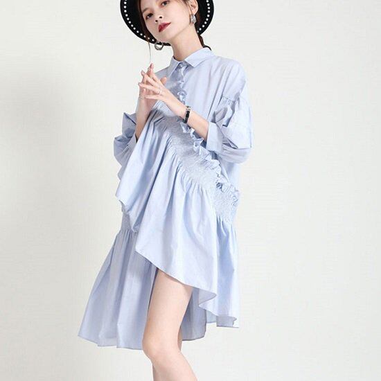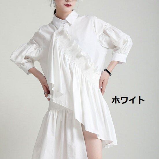 シャツワンピース シャーリング 長袖 フリル チュニック ミニ丈 ミニワンピ シャツワンピ バルーン袖 ボリューム袖 アシンメトリー ラップワンピ ワンピース シャツワンピース シャーリング 長袖