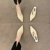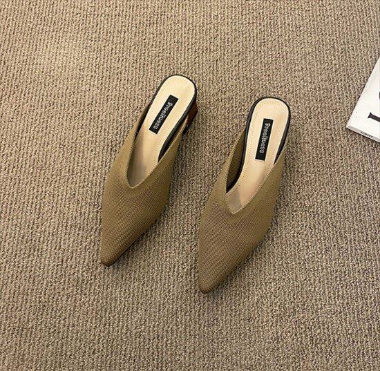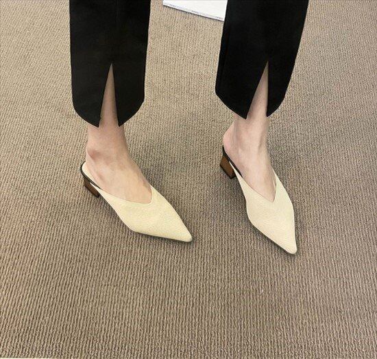 ミュール パンプス ミドルヒール ゴールドヒール V口 ポインテッドトゥ セミスリッパ 春 秋 ブラック カーキ アプリコット ラバー チャンキーヒール Vカット 4cm 大きいサイズ シューズ 靴