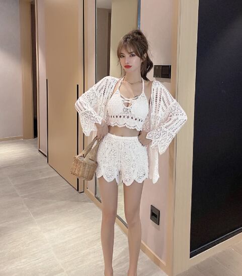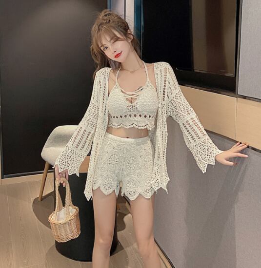ビキニ レディース 水着 3点セット カバーアップ付き 長袖 セパレート ショートパンツ クロシェ編み ホルターネック ハイウエスト 体型カバー スリーピース スイムウェア ビーチウェア 海 夏
